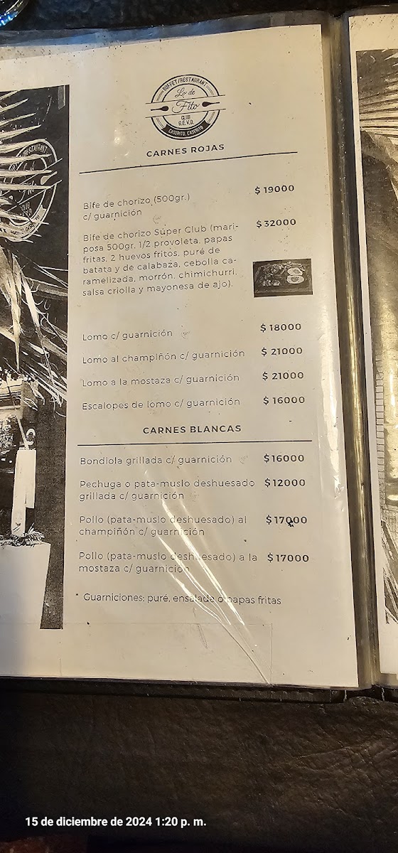 “ Delicious food, as home made! You may sit inside or outside under the stars, by nice palm trees. Cozzy atmosphere. Quick service. Very nice personal who inmediately placed a table outside for us when all outside tables were full. As starter we took picada calentita, great selection of very traditional warm starters, and musslor. Afterwards we took bife de costilla, 2 chicken dishes, salad and pasta carbonara. Everything well done and nicely presented. We did not make it for desserts, because the portions were quite big. A special mention to the waitress Gabriela who made unforgetable pur already lovely night, with her extraordinary sense of humour and enormeus talent to keep high level service meantime chatting and joking with the costumers. Lo de Fito is a big YES, I WILL CERTAINLY COME BACK! ”
